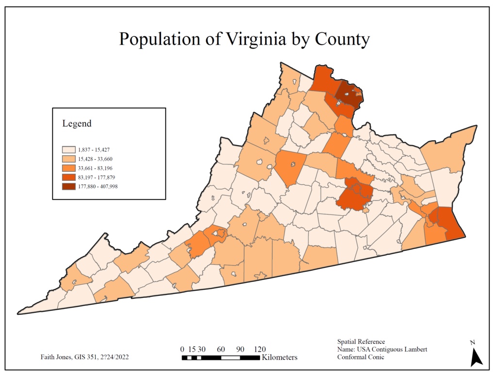 A skill we practiced heavily in Spatial Analysis was creating high quality maps that display data in the best way. I had to practice how to best format map elements without leaving large gaps of blank spaces. When you have an oddly shaped area you’re focusing on, it can be hard to use an entire map area. By my midterm, I began improving the format of my maps and began understanding how to use space without overcrowding my maps.
